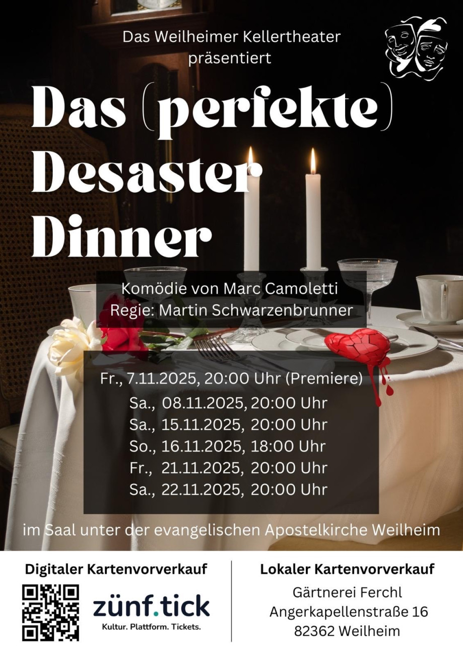 Komödie von Marc Camoletti - Wir freuen uns sehr, dass das Weilheimer Kellertheater auch in diesem Jahr wieder ein Stück vorbereitet hat! Die Komödie "Das (perfekte) Desaster Dinner" wird an mehreren Abenden im November im Saal unter der Kirche aufgeführt. DIe Premiere findet am Freitag, 07. November, um 20 Uhr statt. Regie führt Martin Schwarzenbrunner.